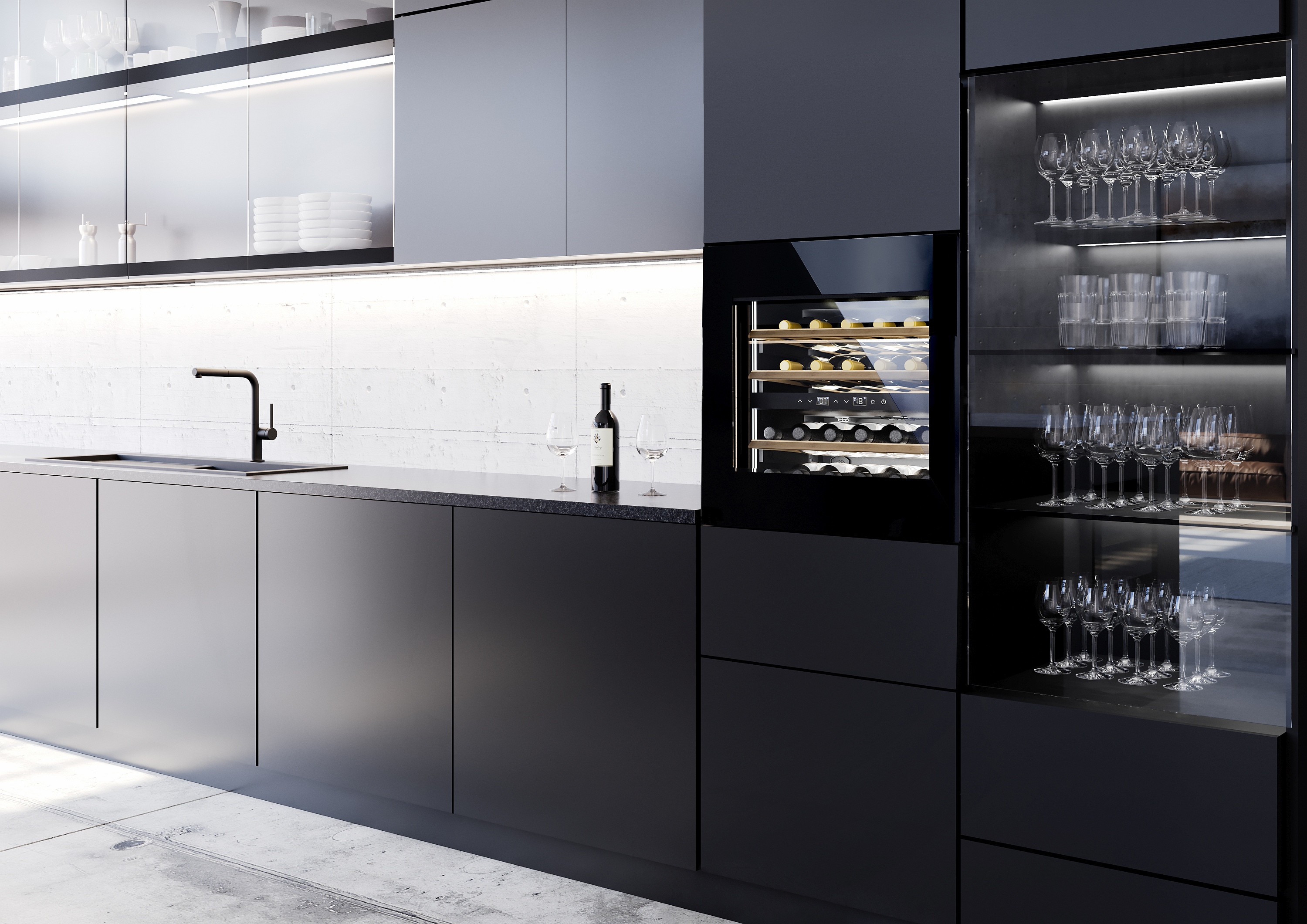 CASO Design schwarze Küche mit Kochinsel Kochfeld mit Kochfeldabzug Weinklimaschrank